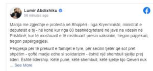 Kryetari i Lidhjes Demokratike të Kosovës, Lumir Abdixhiku në postimin e tij në Facebook ka kritikuar Qeverinë Kurti duke thënë se në kulmin e krizës shëndetësore e ekonomike, pozita e zgjedhur për të prirë këtu, ka zgjedhur të jetë opozitë protestash e fushatash në një tjetër shtet.