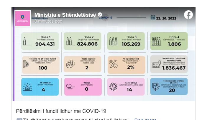 Instituti Kombëtar i Shëndetësisë së Kosovës përmes postimit në rrjetin social Facebook, ka publikuar rastet e të infektuarve me COVID-19, më 22.10.2022.