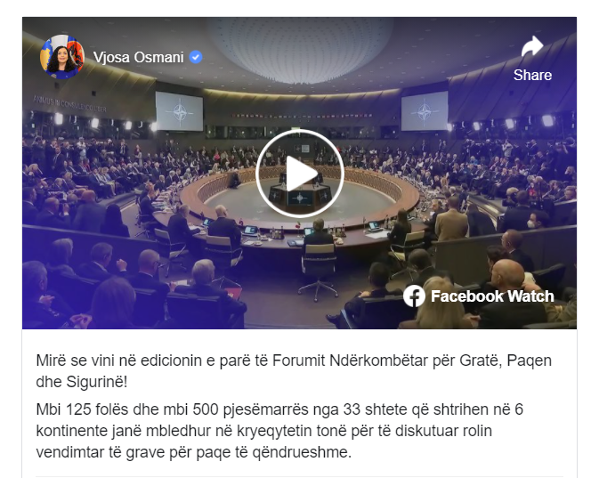 Në këtë Forum po marrin pjesë liderë botërorë, ekspertë, akademikë, përfaqësues të shoqërisë civile, të rinj dhe përfaqësues nga grupe të tjera të interesit, thuhet në postimin në Facebook të presidentes së Kosovës, Vjosa Osmani.