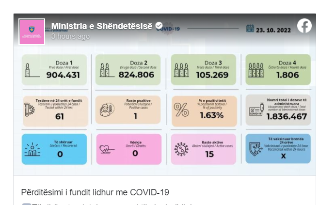 Instituti Kombëtar i Shëndetësisë së Kosovës përmes postimit në rrjetin social Facebook, ka publikuar rastet e të infektuarve me COVID-19, më 23.10.2022.