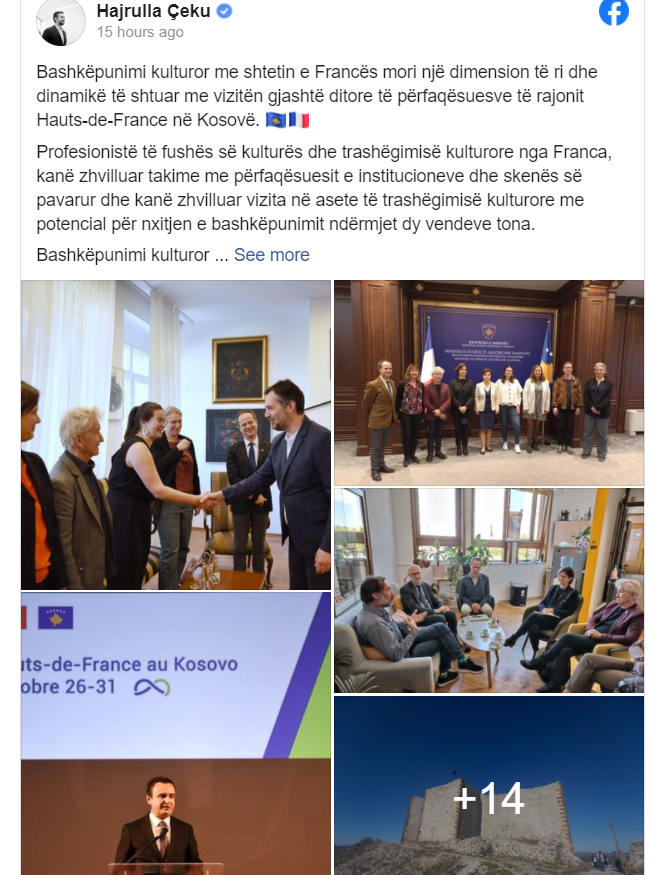 Çeku në postimin e tij në Facebook ka thënë se profesionistë të fushës së kulturës dhe trashëgimisë kulturore nga Franca, kanë zhvilluar takime me përfaqësuesit e institucioneve dhe skenës së pavarur dhe kanë zhvilluar vizita në asete të trashëgimisë kulturore me potencial për nxitjen e bashkëpunimit ndërmjet dy vendeve tona.