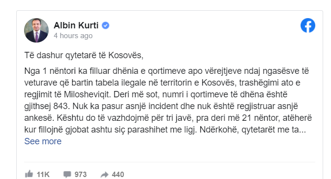 Kurti në postimin e tij në Facebook ka thënë se qytetarët serbë në Kosovë të mos bien pre e manipulimeve politike dhe lojërave gjeopolitike. Le t’i përmbahemi të gjithë bashkë vlerave demokratike dhe evropiane të sundimit të ligjit, të të drejtave dhe lirive të njeriut e të pakicave, pluralizmit politik.