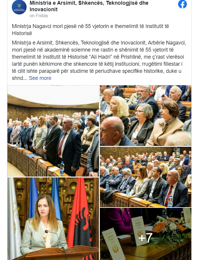 Ministrja e Arsimit, Shkencës, Teknologjisë dhe Inovacionit, Arbërie Nagavci, mori pjesë në akademinë solemne me rastin e shënimit të 55 vjetorit të themelimit të Institutit të Historisë “Ali Hadri” në Prishtinë, me ç’rast vlerësoi lartë punën kërkimore dhe shkencore të këtij institucioni, rrugëtimi fillestar i të cilit ishte paraparë për studime të periudhave specifike historike, duke u shndërruar më vonë në një Institut me fushëveprim të gjerë historik dhe shkencor.