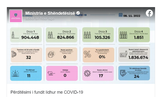 Instituti Kombëtar i Shëndetësisë së Kosovës përmes postimit në rrjetin social Facebook, ka publikuar rastet e të infektuarve me COVID-19, më 08.11.2022.