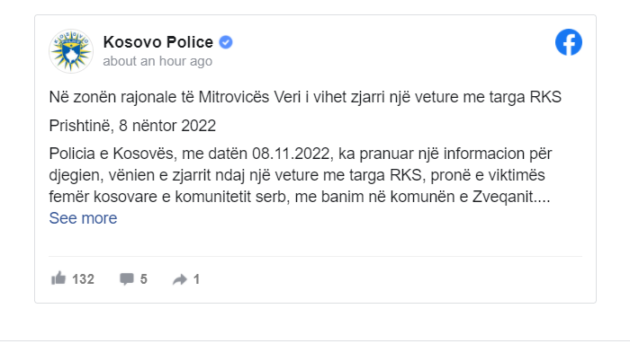 Policia e Kosovës, me datën 08.11.2022, ka pranuar një informacion për djegien, vënien e zjarrit ndaj një veture me targa RKS, pronë e viktimës femër kosovare e komunitetit serb, me banim në komunën e Zveqanit.