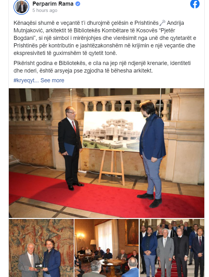Rama në postimin e tij në Facebook ka thënë se ishte kënaqësi shumë e veçantë t’i dhurojmë çelësin e Prishtinës Andrija Mutnjaković, arkitektit të Bibliotekës Kombëtare të Kosovës “Pjetër Bogdani”, si një simbol i mirënjohjes dhe vlerësimit nga unë dhe qytetarët e Prishtinës për kontributin e jashtëzakonshëm në krijimin e një veçantie dhe ekspresiviteti të guximshëm të qytetit tonë.