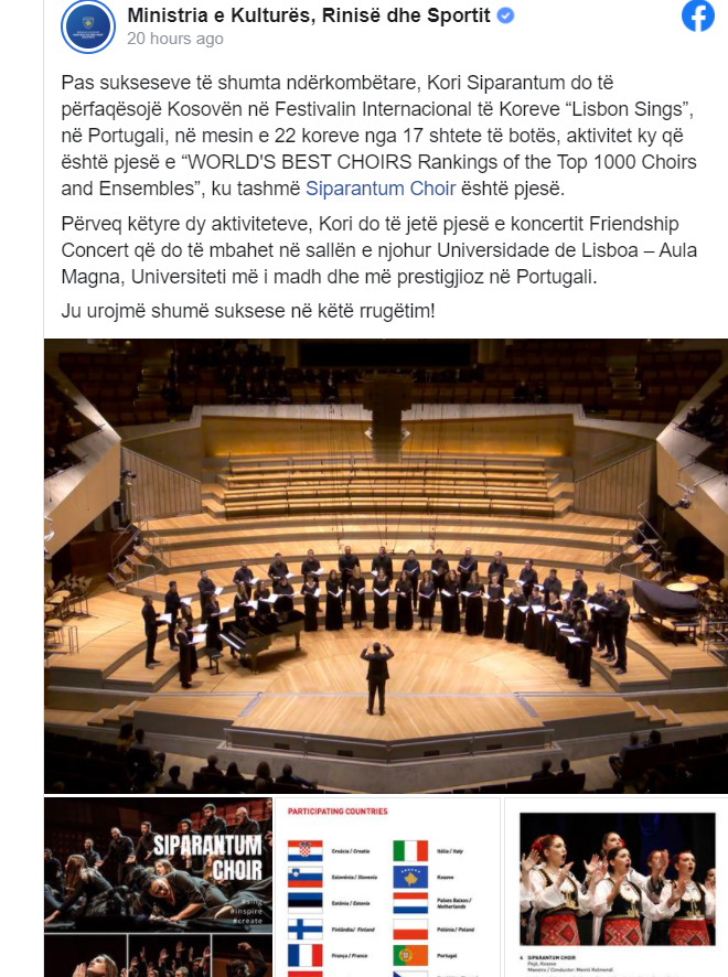 Ministria e Kulturës njofton se pas sukseseve të shumta ndërkombëtare, Kori Siparantum do të përfaqësojë Kosovën në Festivalin Internacional të Koreve “Lisbon Sings”, në Portugali, në mesin e 22 koreve nga 17 shtete të botës, aktivitet ky që është pjesë e “WORLD’S BEST CHOIRS Rankings of the Top 1000 Choirs and Ensembles”, ku tashmë Siparantum Choir është pjesë.