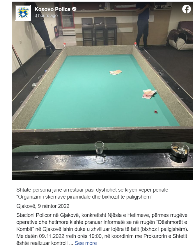Stacioni Policor në Gjakovë, konkretisht Njësia e Hetimeve, përmes rrugëve operative dhe hetimore kishte pranuar informatë se në rrugën “Dëshmorët e Kombit” në Gjakovë ishin duke u zhvilluar lojëra të fatit (bixhoz i paligjshëm).