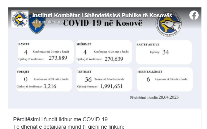 Instituti Kombëtar i Shëndetësisë së Kosovës përmes postimit në rrjetin social Facebook, ka publikuar rastet e të infektuarve me COVID-19, më 05.04.2023.