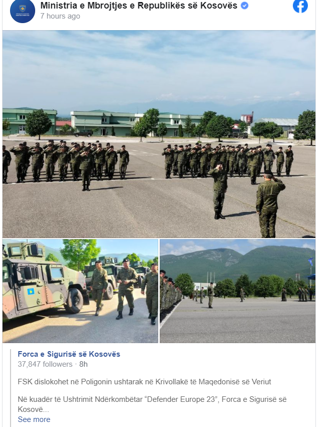 Ministria e Mbrojtjes ka njoftuar se në kuadër të Ushtrimit Ndërkombëtar “Defender Europe 23”, Forca e Sigurisë së Kosovës, ka dislokuar sot një kompani të regjimentit të Këmbësorisë në Poligonin Krivollakë të Maqedonisë së Veriut, ku do i bashkangjitet Batalionit multi-nacional për zhvillimin e trajnimit të përbashkët.