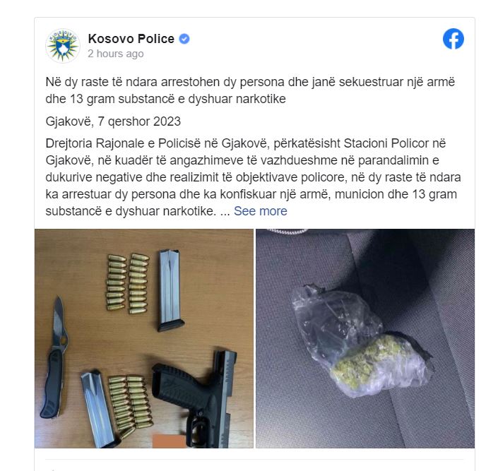 Drejtoria Rajonale e Policisë në Gjakovë, përkatësisht Stacioni Policor në Gjakovë, në kuadër të angazhimeve të vazhdueshme në parandalimin e dukurive negative dhe realizimit të objektivave policore, në dy raste të ndara ka arrestuar dy persona dhe ka konfiskuar një armë, municion dhe 13 gram substancë e dyshuar narkotike.