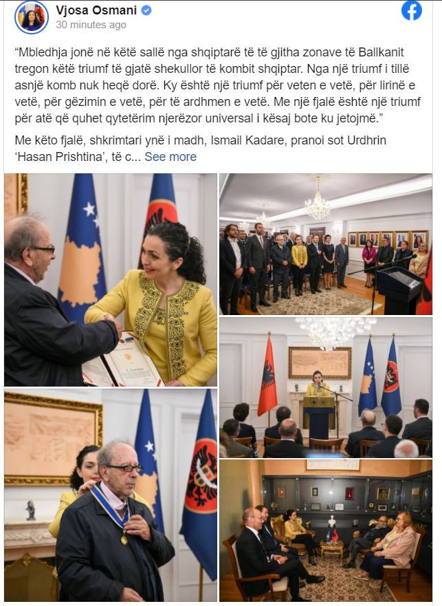 Presidentja Osmani në postimin e saj në Facebook ka thënë se shkrimtari ynë i madh, Ismail Kadare, pranoi sot Urdhrin ‘Hasan Prishtina’, të cilin pata nderin t’ia ndajë në emër të popullit të Kosovës.Ky Urdhër i është ndarë për mjeshtërinë e jashtëzakonshme në artin e fjalës, shprehur gjithandej veprave të tij, për përkushtimin me të cilin e ka mbrojtur të drejtën e Kosovës, si dhe për vlerat letrare e intelektuale me të cilat është paraqitur nëpër botë dhe me të cilat e ka lartësuar gjithandej gjuhën, kulturën e letërsinë shqipe dhe vetë popullin shqiptar.