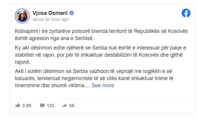Presidentja Osmani në postimin e saj në Facebook ka thënë se ky akt dëshmon edhe njëherë se Serbia nuk është e interesuar për paqe e stabilitet në rajon, por për të shkaktuar destabilizim të Kosovës dhe gjithë rajonit.