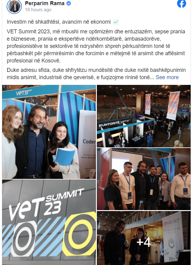 Kryetari i Komunës së Prishtinës, Përparim Rama ka njoftuar se VET Summit 2023, më mbushi me optimizëm dhe entuziazëm, sepse prania e bizneseve, prania e ekspertëve ndërkombëtarë, ambasadorëve, profesionistëve te sektorëve të ndryshëm shpreh përkushtimin tonë të përbashkët për përmirësimin dhe forcimin e mëtejmë të arsimit dhe aftësimit profesional në Kosovë.