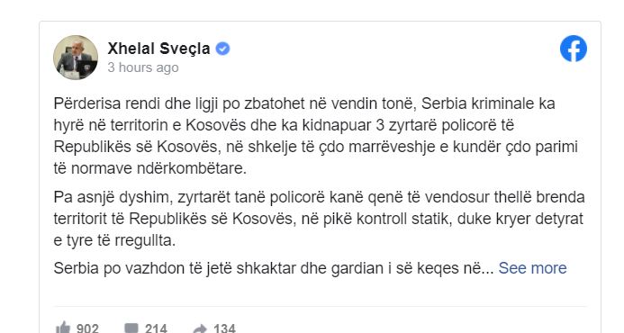 Ministri i Punëve të Brendshme, Xhelal Sveçla ka njoftuar se përderisa rendi dhe ligji po zbatohet në vendin tonë, Serbia kriminale ka hyrë në territorin e Kosovës dhe ka kidnapuar 3 zyrtarë policorë të Republikës së Kosovës, në shkelje të çdo marrëveshje e kundër çdo parimi të normave ndërkombëtare. Pa asnjë dyshim, zyrtarët tanë policorë kanë qenë të vendosur thellë brenda territorit të Republikës së Kosovës, në pikë kontroll statik, duke kryer detyrat e tyre të rregullta.