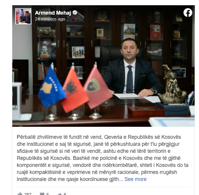 Ministri i Mbrojtjes, Armend Mehaj ka njoftuar se përballë zhvillimeve të fundit në vend, Qeveria e Republikës së Kosovës dhe institucionet e saj të sigurisë, janë të përkushtuara për t’iu përgjigjur sfidave të sigurisë si në veri të vendit, ashtu edhe në tërë territorin e Republikës së Kosovës. Bashkë me Policinë e Kosovës dhe me të gjithë komponentët e sigurisë, vendorë dhe ndërkombëtarë, shteti i Kosovës do ta ruajë kompaktësinë e veprimeve në mënyrë racionale, përmes rrugësh intitucionale dhe me qasje koordinuese gjithëpërfshirëse.