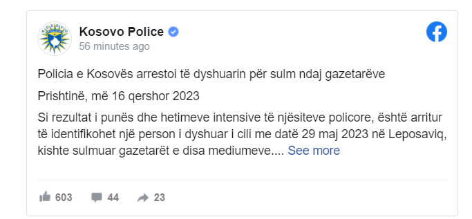 Policia e Kosovës ka bërë të ditur se si rezultat i punës dhe hetimeve intensive të njësiteve policore, është arritur të identifikohet një person i dyshuar i cili me datë 29 maj 2023 në Leposaviq, kishte sulmuar gazetarët e disa mediumeve.