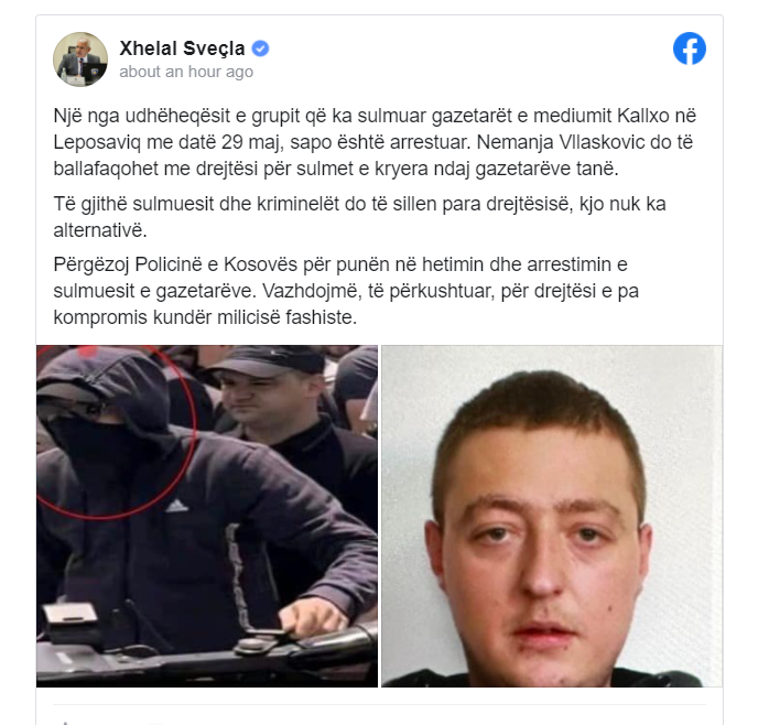 Ministri i Punëve të Brendshme, Xhelal Sveçla ka njoftuar se një nga udhëheqësit e grupit që ka sulmuar gazetarët e mediumit Kallxo në Leposaviq me datë 29 maj, sapo është arrestuar. Nemanja Vlaskovic do të ballafaqohet me drejtësi për sulmet e kryera ndaj gazetarëve tanë.
