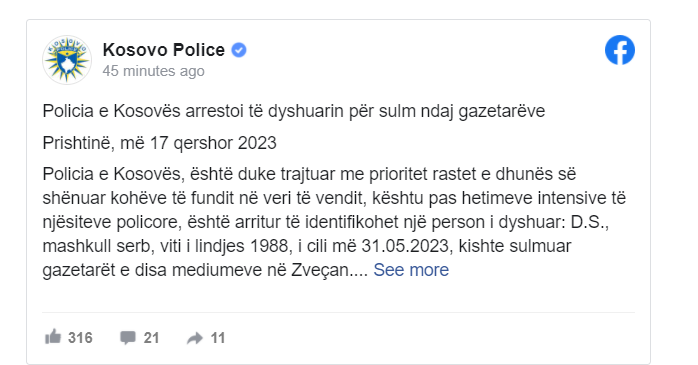 Policia e Kosovës, është duke trajtuar me prioritet rastet e dhunës së shënuar kohëve të fundit në veri të vendit, kështu pas hetimeve intensive të njësiteve policore, është arritur të identifikohet një person i dyshuar: D.S., mashkull serb, viti i lindjes 1988, i cili më 31.05.2023, kishte sulmuar gazetarët e disa mediumeve në Zveçan.