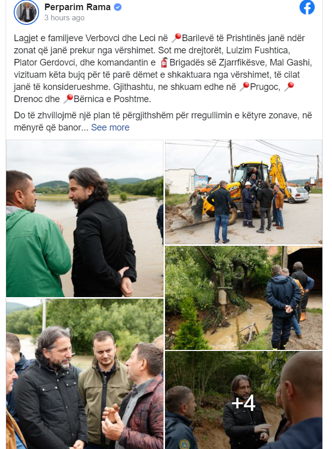 Rama në postimin e tij në Facebook ka thënë se do të zhvillojmë një plan të përgjithshëm për rregullimin e këtyre zonave, në mënyrë që banorët dhe bujqit të mos përballen më me probleme të tilla në të ardhmen. Ne do të merremi gjithashtu me kompensimin e dëmeve, disa prej të cilave do t’u jepen direkt banorëve nga institucionet e Kryeqytetit, ndërsa disa të tjera do të përfshihen edhe institucionet e tjera.