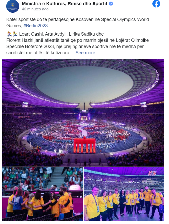 Ministria e Kulturës, Rinisë dhe Sportit ka njoftuar se katër sportistë do të përfaqësojnë Kosovën në Special Olympics World Games, Berlin 2023, Leart Gashi, Arta Avdyli, Lirika Sadiku dhe Florent Haziri janë atleatët tanë që po marrin pjesë në Lojërat Olimpike Speciale Botërore 2023, një prej ngjarjeve sportive më të mëdha për sportistët me aftësi të kufizuara.