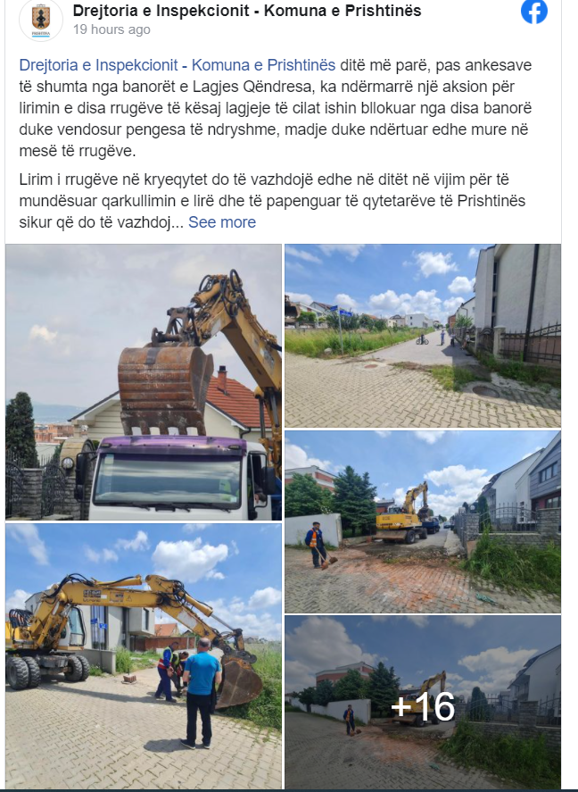 Drejtoria e Inspekcionit – Komuna e Prishtinës ditë më parë, pas ankesave të shumta nga banorët e Lagjes Qëndresa, ka ndërmarrë një aksion për lirimin e disa rrugëve të kësaj lagjeje të cilat ishin bllokuar nga disa banorë duke vendosur pengesa të ndryshme, madje duke ndërtuar edhe mure në mesë të rrugëve.