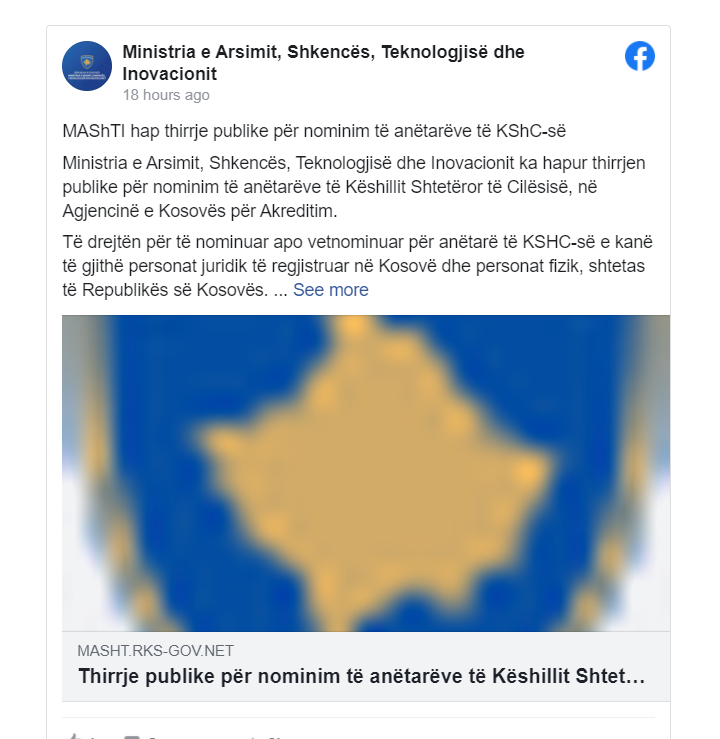 Ministria e Arsimit, Shkencës, Teknologjisë dhe Inovacionit ka hapur thirrjen publike për nominim të anëtarëve të Këshillit Shtetëror të Cilësisë, në Agjencinë e Kosovës për Akreditim.
