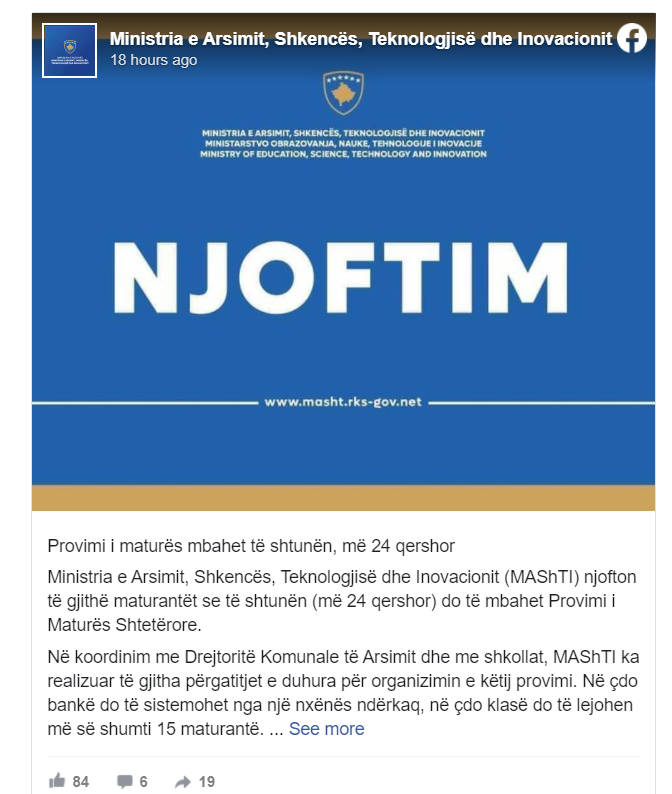 Ministria e Arsimit, Shkencës, Teknologjisë dhe Inovacionit mbetet e përkushtuar për organizimin dhe zhvillimin e një procesi të mirëfilltë e të besueshëm, prandaj kërkon që çfarëdo parregullsi eventuale në qendrën e testimit, të raportohet me shkrim në DKA dhe në MAShTI.