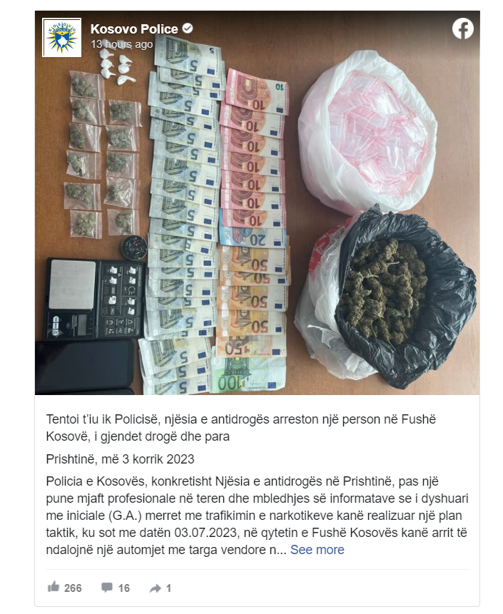 Policia e Kosovës do të ndërmerr masa dhe veprime rigoroze ligjore ndaj të gjithë atyre personave të përfshirë në vepra penale, në veçanti zero tolerancë do të aplikohet ndaj personave që merren me abuzimin dhe trafikimin e substancave narkotike, thuhet në postimin në Facebook të PK-së.