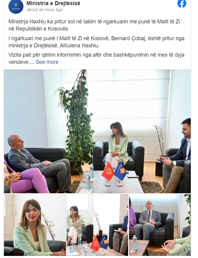 Ministrja e Drejtësisë Albulena Haxhiu ka pritur sot në takim të ngarkuarin me punë të Malit të Zi në Republikën e Kosovës, Bernard Çobaj.