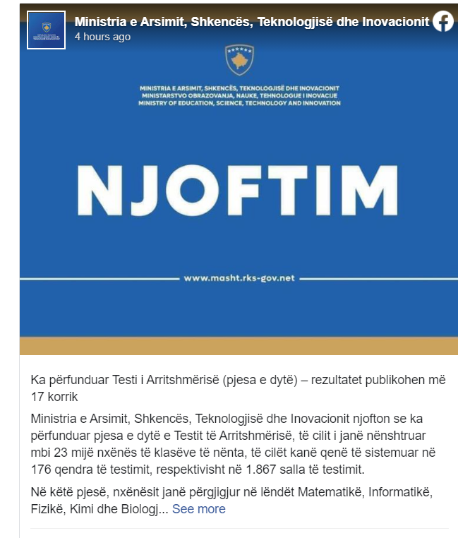 Ministria e Arsimit, Shkencës, Teknologjisë dhe Inovacionit njofton se ka përfunduar pjesa e dytë e Testit të Arritshmërisë, të cilit i janë nënshtruar mbi 23 mijë nxënës të klasëve të nënta, të cilët kanë qenë të sistemuar në 176 qendra të testimit, respektivisht në 1.867 salla të testimit.