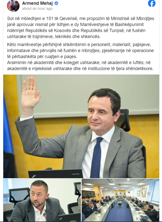 Ministri i Mbrojtjes, Armend Mehaj ka njoftuar se sot në mbledhjen e 151 të Qeverisë, me propozim të Ministrisë së Mbrojtjes janë aprovuar nismat për lidhjen e dy Marrëveshjeve të Bashkëpunimit ndërmjet Republikës së Kosovës dhe Republikës së Turqisë, në fushën ushtarake të trajnimeve, teknikës dhe shkencës.