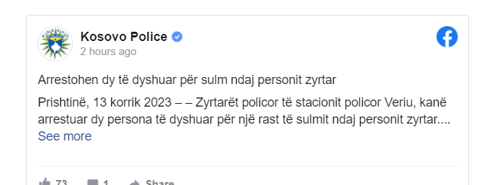 Ngjarja ka ndodhur mbrëmë, rreth orës 18:00, në rrugën “Fahri Fazliu” në Prishtinë, me ç’ rast policia arrestoi të dyshuarit; S. A, mashkull, 22 vjeç, shtetas i Republikës së Kosovës, si M. A, mashkull, 20 vjeç, shtetas i Republikës së Kosovës, si të dyshuar të implikuar në rast.